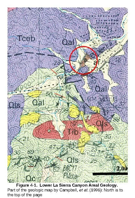 The drilling site in La Sierra Canyon was selected apparently for the purpose of exploring a section of what has been most recently defined by Yerkes and Campbell (1979) as the Topanga Canyon Formation, a marine formation of middle Miocene age that is exposed farther up La Sierra Canyon from the Park. Locally, it has been mapped by Campbell, et al. (1996) (see Figure 4-1). The boring, now the Park's hot spring well, is adjacent to Blackfoot Drive which, like the rest of the Park area, is underlain by a section of the Miocene Conejo Volcanic.